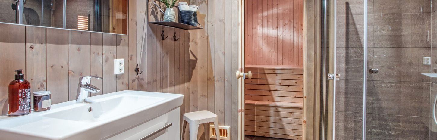 versetzten Fassade. Die großen Fenster zeigen nach Süden und lassen viel Licht ins Haus. Die Hütte ist gut ausgestattet mit einer offenen Wohn- Esszimmerlösung, drei geräumigen Schlafzimmern, der großen Diele, einem Bad mit Sauna und einem Gäste WC. Außerdem gibt es eine große Außenbod.